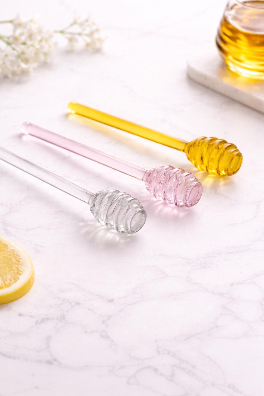 Made from high-quality glass in clear, soft pink, or golden amber, each spoon features a delicate spiral head that perfectly holds and releases honey with ease.